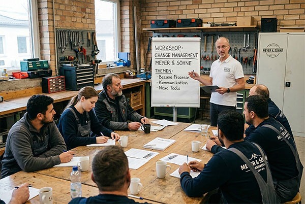 Wir begleiten Handwerksbetriebe und Dienstleistungsunternehmen dabei, ihre Strukturen, Prozesse und Teams so aufzustellen, dass Veränderung gelingt – praxisnah, auf Augenhöhe und mit bewährten agilen Methoden.